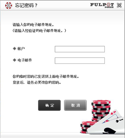 作为一个重要的安全特徵,所有FULPOT扑克账户需要以经验证的电邮地址互相关联。如您需要恢复用户ID和/或密码是,我们需要知道进行这操作需求的帐户拥有者。